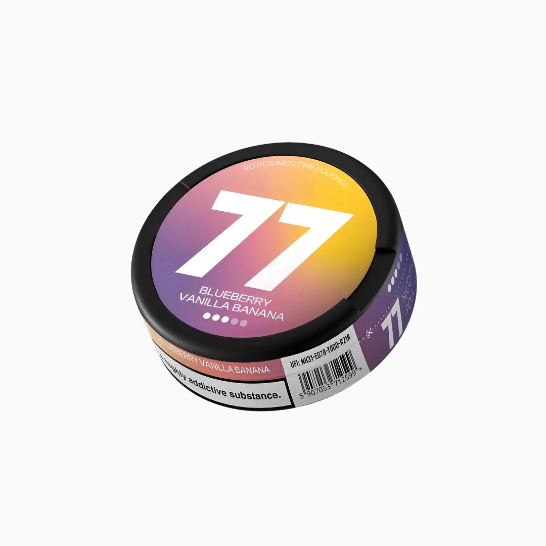 77 Blueberry Vanilla Banana nicotine pouches are a dessert-style pouch that blends ripe blueberry, creamy vanilla, and mellow banana into one balanced tin.